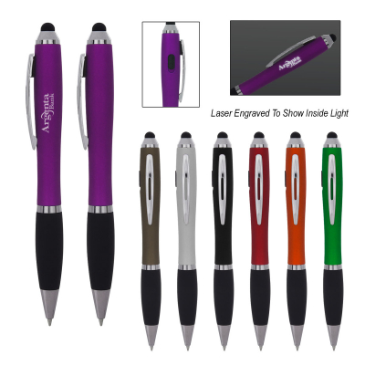 Twist Action | Extra Bright White LED Light | Slide Switch To Turn Light On/Off | Rubber Grip For Writing Comfort And Control | Stylus On Top | Battery Included. Approximate Size: 5 1/2″ H, Imprint Area: 1 3/8″ W x 1/4″ H
