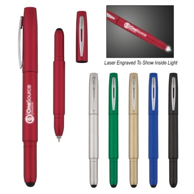 Stylus On Top | Extra Bright White LED Light | Cap Action Over Stylus To Turn Light On | Batteries Included. Approximate Size: 6″ H , Imprint Area: 1″ W x 3/8″ H