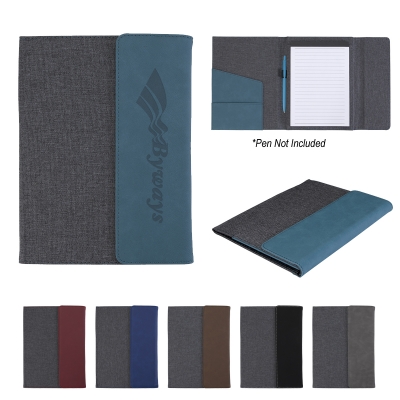 Includes 50 Page Lined 5″ x 7″ Writing Pad | Elastic Pen Loop And 2 Inside Flap Pockets | Magnetic Closure | 210D Nylon And Polyurethane Leatherette Cover. Approximate Size: 7″ W x 9 1/4″ H, Imprint Area: 1 1/2″ W x 6″ H