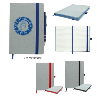 100 Page Lined Notebook | Matching Strap, Bookmark, Pen Loop And Colored Paper Edge | Polyurethane Cover. Approximate Size: 5 3/4″ x 8 1/2″, Imprint Area: 3″ W x 4″ H