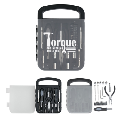 Includes 4 Phillips Head Bits, 3 Torx Head Bits, 2 Flat Head Bits, 5 Sockets, 2 Allen Wrenches, Mini Phillips Head Screwdriver, Mini Flat Head Screwdriver And Needlenose Pliers | Easy Carrying Handle. Approximate Size: 6 1/4″ W x 8 1/2″ H, Imprint Area: 4 1/2″ W x 4 1/2″ H