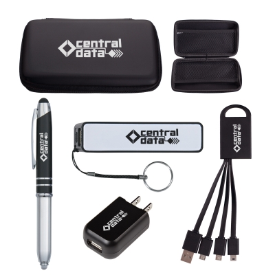 Pricing Includes a 1 Color Imprint in 1 Location on Each Item | Kit Includes: #2811: Electronics Travel Case, #2614UL: UL Listed Portable Charger With Key Ring (UL File #MH60879, Model #2614), #2919: 3-In-1 Charging Buddy, #2823: Rectangular UL Listed USB A/C Adapter and #959 Ballpoint Stylus Pen With Light. Approximate Size: –, Imprint Area: 2811: 4″ W x 2″ H .2614UL: 2 1/4″ W x 1/2″ H .2919: 7/8″ W x 1 1/4″ H .2823: 1 1/4″ W x 3/4″ H .959: 1 3/8″ W x 1/4″ H